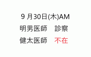 令和3年9月30日(木)午前中の院長(健太医師)の診療は臨時休診となります。尚、理事長(明男医師)は通常どおり、診察を行います。 ご迷惑をおかけして申し訳ありま